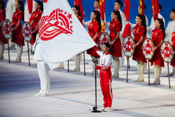 开幕式上,十五运会东道主粤港澳三支代表团共同亮相,展现了大湾区携手同心、共襄体育盛会的风采。当来自粤港澳三地的三位火炬手身着安踏专业装备点燃主火炬,象征团结与奋进的火焰照亮夜空,标志着十五运会正式拉开帷幕。