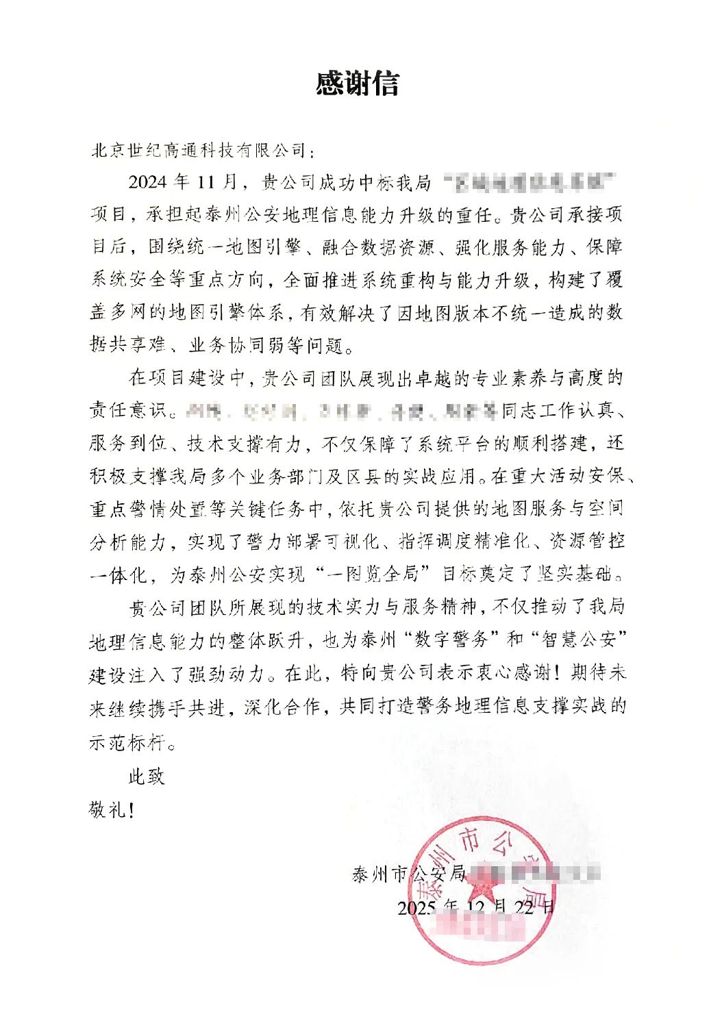 近日,由四维图新旗下世纪高通承建的泰州警用地理信息平台升级项目顺利通过竣工验收,并收获来自泰州市公安局的感谢信。信中高度赞扬了项目团队的努力,称“为泰州公安实现‘一图览全局’目标奠定了坚实基础”。