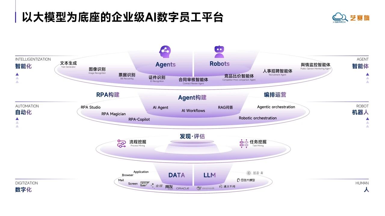 在技术层面,艺赛旗依托iS-AGENT(企业级智能体)、iS-RPA(机器人流程自动化)、iS-RPM(机器人流程挖掘)和iS-CDA(桌面行为分析)四大产品线,构建了覆盖“发现-评估-构建-运行-运营”全链路的智能体自动化解决方案。