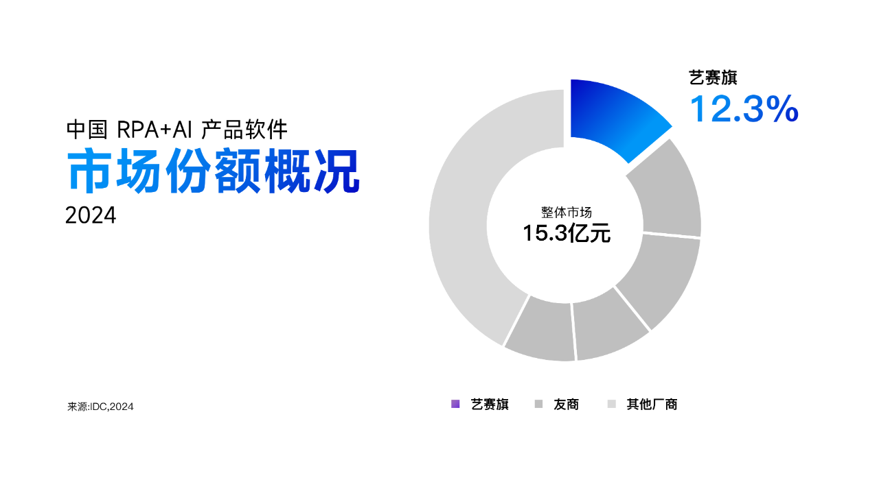 艺赛旗凭借 “企业级流程智能体平台” 的技术突破与行业落地能力,持续领跑中国 RPA+AI 产品市场,2024 年市占率稳居榜首。这一成绩既印证了其在 AI Agent 与 RPA 融合赛道的前瞻布局,也凸显了行业客户对其智能化解决方案的深度认可。