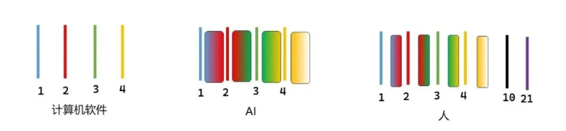 最左边的图就是传统计算机软件处理信息的方式。它只能管理人类创造的知识,只能管理已有的内容。中间的图就是AI处理信息的方式。他具有泛化能力,填补了知识之间的缝隙。能够生成内容。但是他只能在原来内容附近进行泛化,这就是AI最关键的局限性,如果说人能够举一反三。AI只能举100反一。后面我们再来分析。右图是人的泛化能力,就近泛化的话,人是弱于AI的,比如我要想模仿鲁迅的风格写文章,实际上是非常困难的,这对于AI确实很容易的。但是人有远程泛化能力。他学了1,2,3,4。会产生10,会产生21。