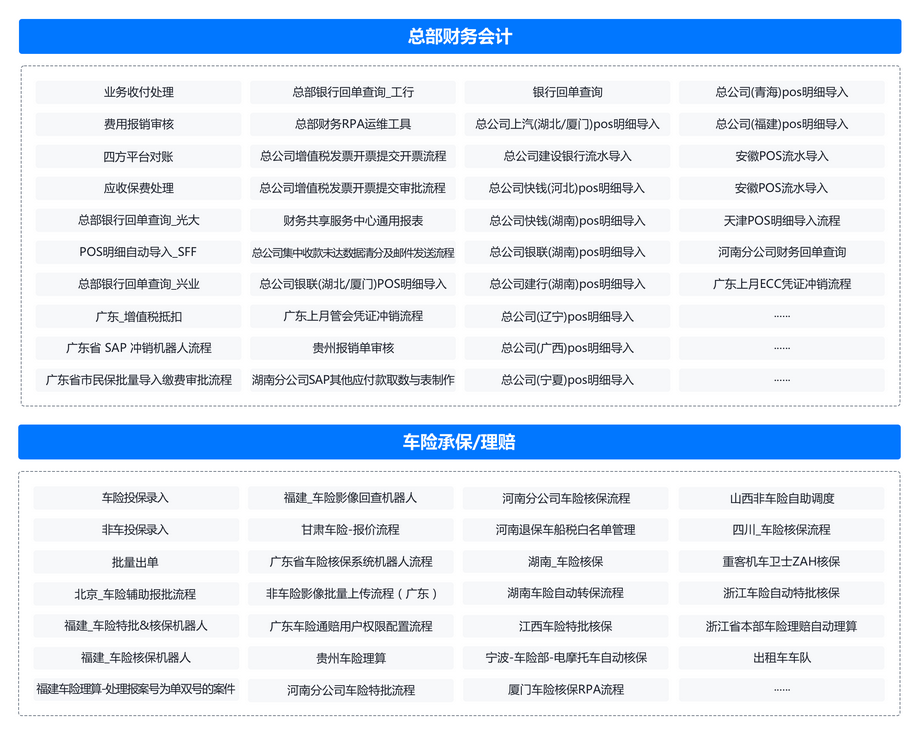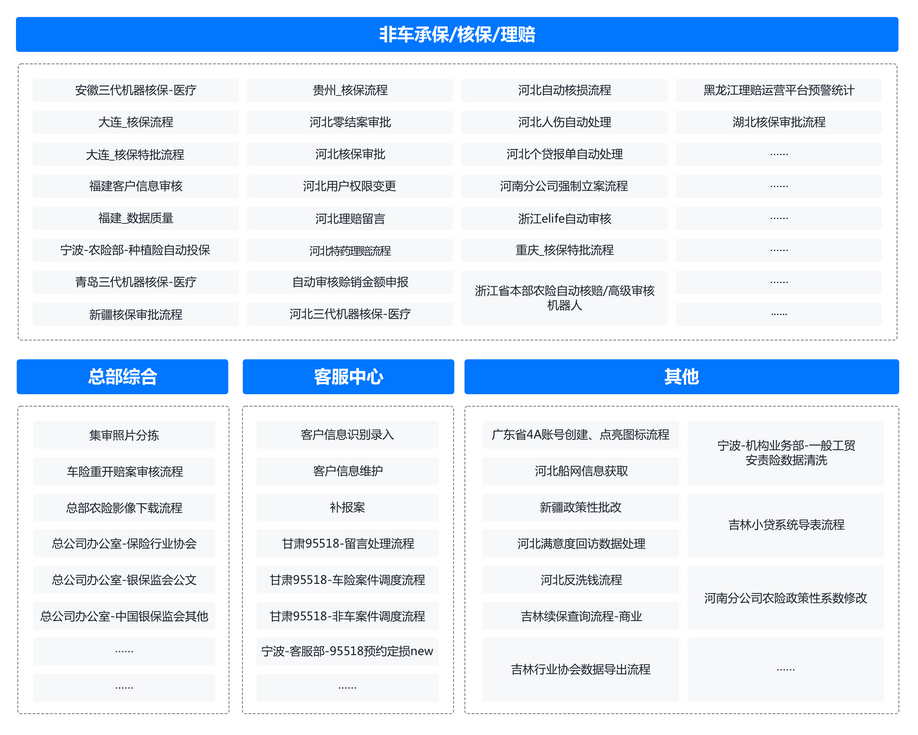 为解决PICC业务集中办理,人工操作重复,易出错等问题。在总部以及天津河北、重庆、安徽等多家分公司试点RPA应用,覆盖财务、理赔、综合办公等场景。