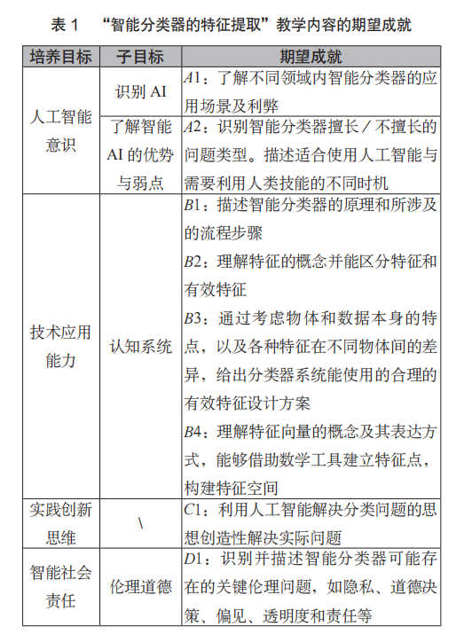 步骤一:根据上述中小学人工智能素养能力重构框架和本节教学内容确定教学最终需要达成的期望成就(见表1)。