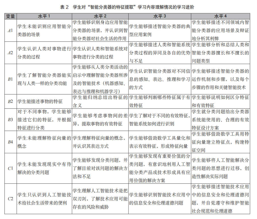 步骤二:学习进阶的开发并不是一蹴而就的,而是一个假设与验证、理论与实践不断交替、逐步完善的过程,最终确认学生理解和发展的真实轨迹。本案例采用自上而下的方法预测学生思维的发展,开发学生对“智能分类器的特征提取”学习内容理解情况的学习进阶(见表2)。该学习进阶还需后续改进、完善。