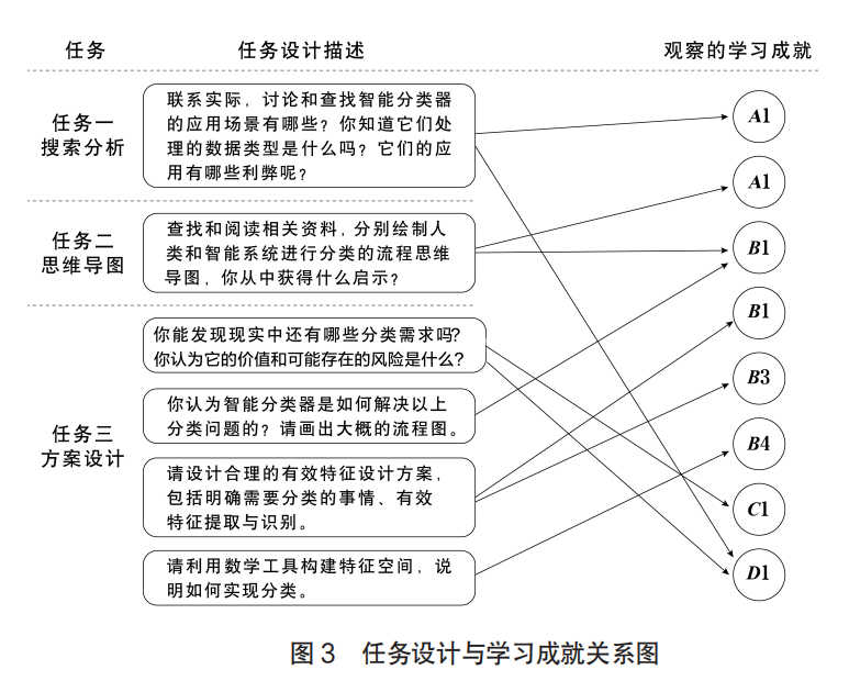 Step 3: The task situation is designed to promote the development of learning and fully demonstrate students’ knowledge, skills, emotions, attitudes and values. So as to help students and teachers understand the learning progress. The corresponding task situation is designed for the learning achievements to be observed (see Figure 3). In general, the tasks progress from easy to difficult. So as to reflect the achievement level of students in the process of completing tasks and the submitted task results. The task situation can be open-ended. For example, the scheme design of task 3 in the case does not give a fixed problem, giving full play to the imagination and observation of students. Of course, it can also be semi-open. Such as the intelligent classification system design of ferns. Which is conducive to reducing the difficulty and workload of teachers’ classroom teaching.
