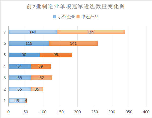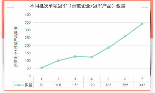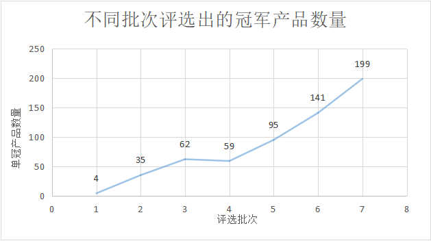 不同批次评选出的示范企业数量见图6,数量上从第一批的49家增加到第七批的140家,增长近2倍。不同批次评选出的冠军产品数量见图7,数量上从第一批的4家增加到第七批的199家,增长近49倍。