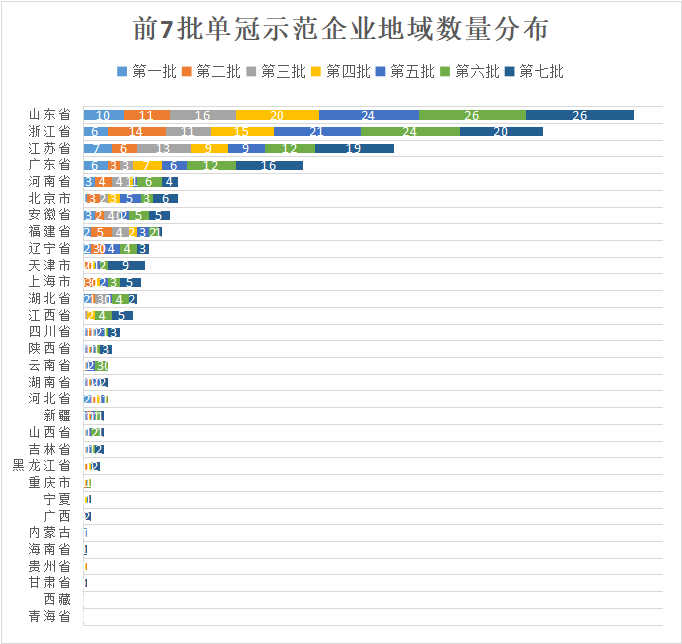 图8给出了32个省/市/自治区的前七个批次单冠示范企业数量分布情况,用不同颜色对不同批次数据加以区分。