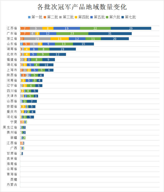图9给出了32个省/市/自治区的前七个批次冠军产品数量分布情况,用不同颜色对不同批次数据加以区分。
