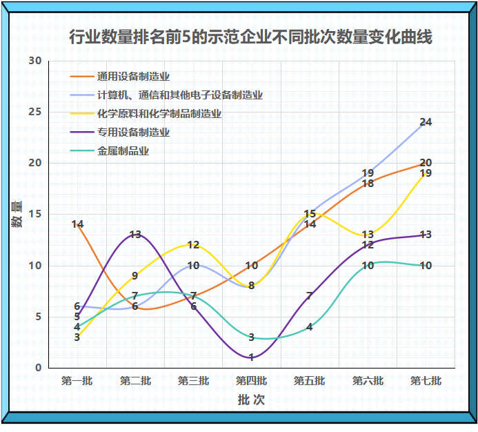 The five industries with the largest number of demonstration enterprises in different batches are general equipment manufacturing; Manufacturing of computers, communications and other electronic equipment; Manufacturing of chemical raw materials and chemical products; Special equipment manufacturing industry; Metal products industry. Figure 10 shows the change of the number of individual champion demonstration enterprises in each batch of national manufacturing industry. It can be seen that the most obvious upward trend is that the computer, communication and other electronic equipment manufacturing industry increased from 6 to 24. After a brief decline, general equipment manufacturing has steadily increased from six to 20 this year.