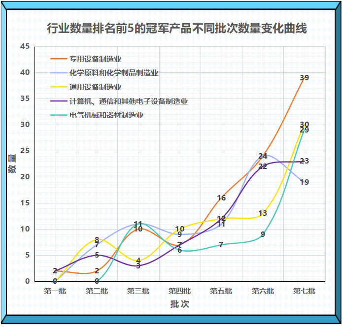 不同批次冠军产品所属企业数量最多的5个行业分别是专用设备制造业;化学原料和化学制品制造业;通用设备制造业;计算机、通信和其他电子设备制造业;电气机械和器材制造等。