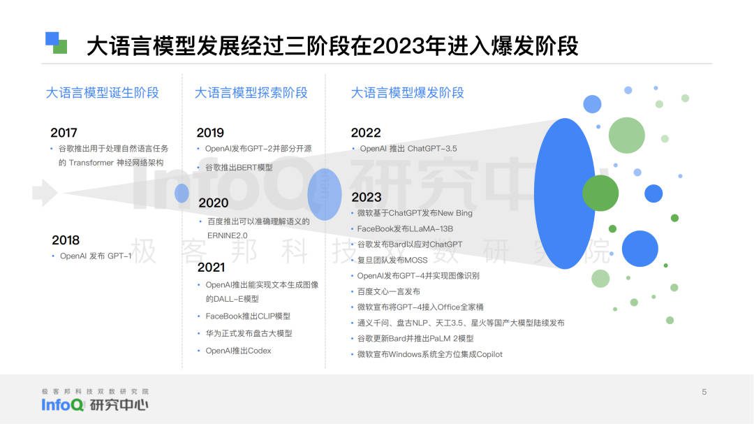 ChatGPT 这一现象级产品横空出世,拉开了大语言模型技术蓬勃发展的序幕。但实际上,自 2017 年大语言模型诞生,OpenAI、微软、谷歌、Facebook、百度、华为等科技巨头在大语言模型领域的探索持续不断,ChatGPT 只是将大语言模型技术推进至了爆发阶段,当下大模型产品格局更是呈现出了新形势——国外基础模型积累深厚,国内应用侧优先发力。