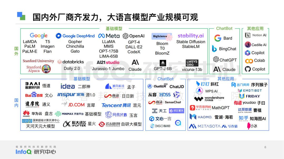 ChatGPT, a phenomenon product, was born and opened the prelude to the vigorous development of large language model technology. But in fact, since the birth of the big language model in 2017, OpenAI, Microsoft, Google, Facebook, Baidu, Huawei and other technology giants continue to explore the field of big language model. ChatGPT only pushed the big language model technology to the explosive stage. At present, the pattern of large model products is showing a new situation – the accumulation of foreign basic models is profound. And the domestic application side gives priority to force.