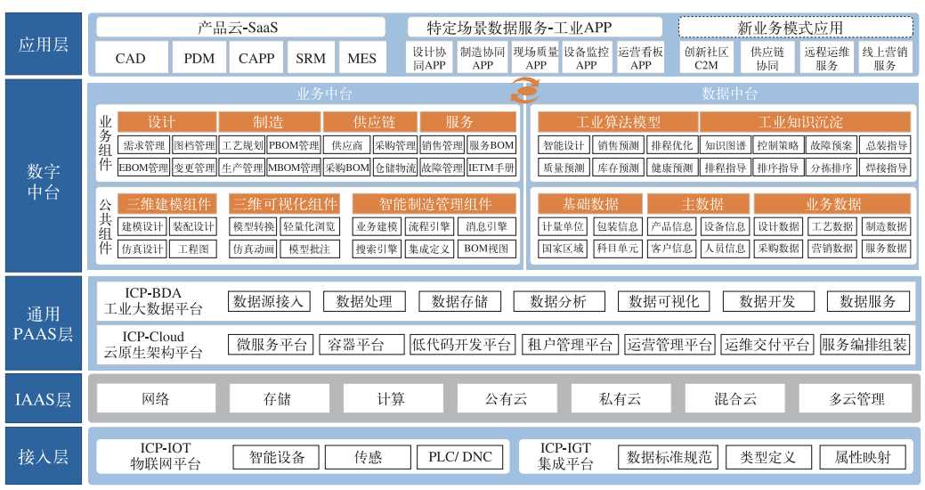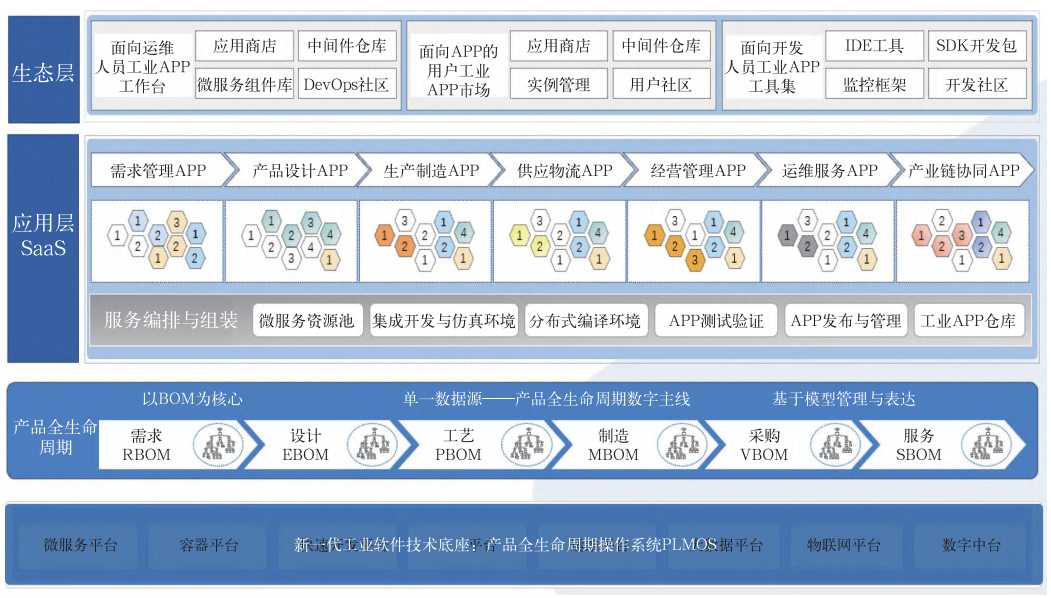 新一代国产化 PLM 系统的技术底座如图 3 所示,全面升级底层技术架构,采用微服务、容器化、DevOps、持续交付等全新技术架构,融合大数据、人工智能、物联网、低代码等最新技术,构建新一代工业软件技术底座“产品全生命周期操作系统 PLMOS”,具备感知数据接入(IOT 物联平台)能力、云架构技术平台集成能力(工业 PaaS)、数字中台(数据中台、业务中台)共性服务能力、工业 APP 应用生态构建能力,遵循业界主流相关标准和技术体制,具有开放性高、可移植性强、兼容性好和可扩展性等特点,支持全栈式服务、高并发、高可用,支持模型驱动和可定制,满足个性化需求应用,实现服务化应用的快速响应和敏捷交付。支持私有云、公有云、混合云,多云部署策略,基于云端的 SaaS 应用、工业 APP 应用,灵活部署以及客户端多样化服务扩展。