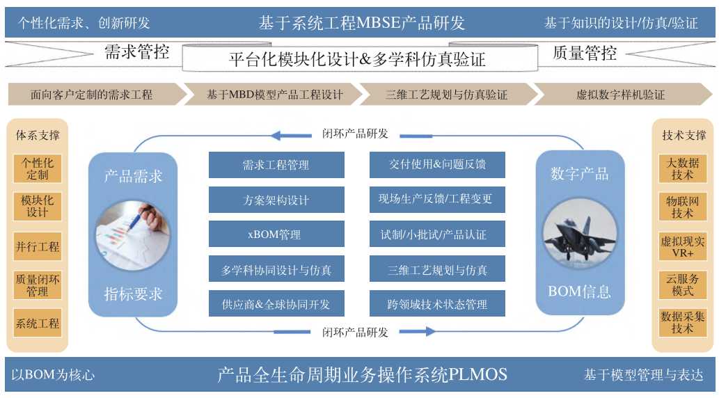 新一代国产化 PLM 系统,要支持产品创新设计、产品正向设计,首先要建立支持 MBSE 的新一代数字化研发体系,贯穿“需求、功能、逻辑、物理、工艺、制造、服务保障”诸领域,建立覆盖产品全生命周期的全局统一数据模型,形成产品数字主线、支持全局数据追溯的研发数据管理能力。如图 2 所示,构建基于模型的系统工程设计MBSE 需求模型、功能模型、逻辑模型、物理模型,建立多专业、多学科综合仿真的闭环及迭代验证体系。针对产品工程阶段的物理、工艺、制造、服务领域模型,构建基于 xBOM 的关联管理体系,实现产品全生命周期各领域技术状态统一管控,实现产品全生命周期过程数据及产品数据的有效管理、可溯源、可持续发展。