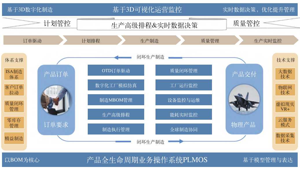 基于新一代国产化 PLM 系统,在产品生命周期各个阶段,以 BOM 为核心,基于模型管理和表达,开展创新研发、卓越制造、敏捷服务等业务蓝图应用,通过数字主线连续贯通用户需求、产品设计、产品制造和产品服务等业务环节,以数字模型为基础,通过数字化的形式完整记录整个产品生命周期的状态变化,实现产品全生命周期数据融合、全局共享、全局优化。