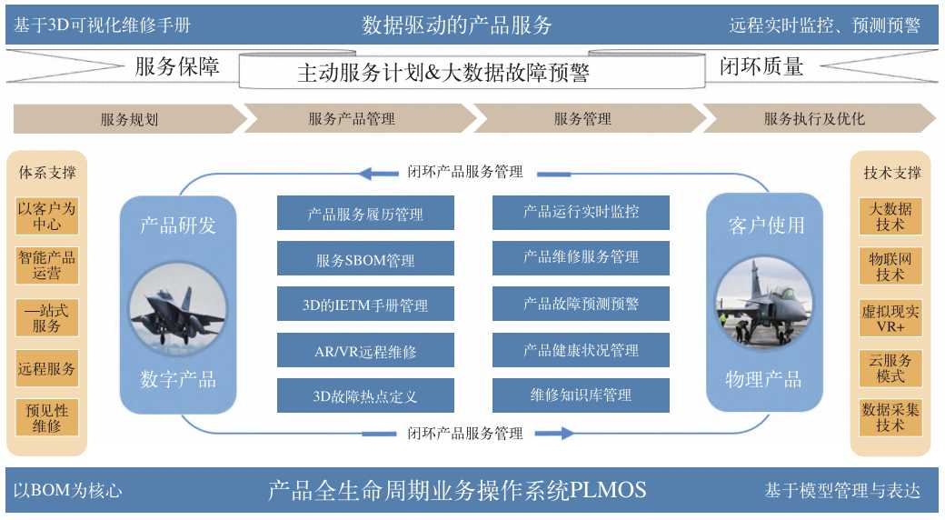 “敏捷服务”应用场景如图 8 所示,以客户为中心,面向智能产品运营,引入一站式服务、远程服务等新服务模式,构建敏捷服务规划及运营环境,形成产品服务规划、运营、优化的互联闭环服务体系,以 xBOM 为核心,建立产品电子履历实时动态管理,通过 SBOM 有序传递,实物状态有效全面控制。建立预防性维修、预见性维修等多级服务机制,快速响应主动服务,实现产品高效可靠运营以及盈利模式创新。
