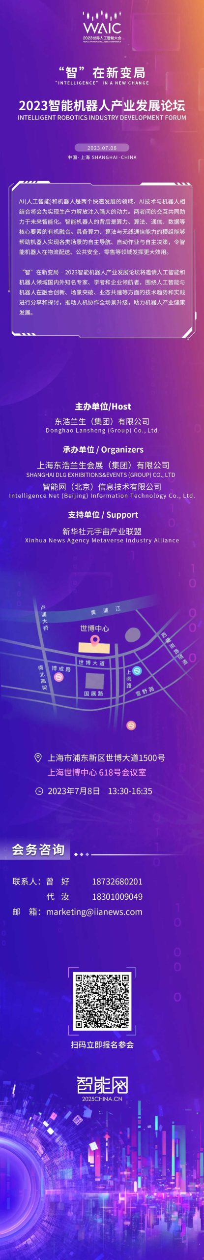 本次论坛将探讨智能机器人行业的发展趋势和前景,突出人工智能、机器人技术和互联网的深度融合。与会嘉宾将共同探讨人机协作、智能感知、自主导航等关键领域的创新突破,推动智能机器人在生产制造、医疗护理、服务业、交通运输等领域的广泛应用,为实现智慧城市、智能工厂和智慧社区的建设贡献力量。