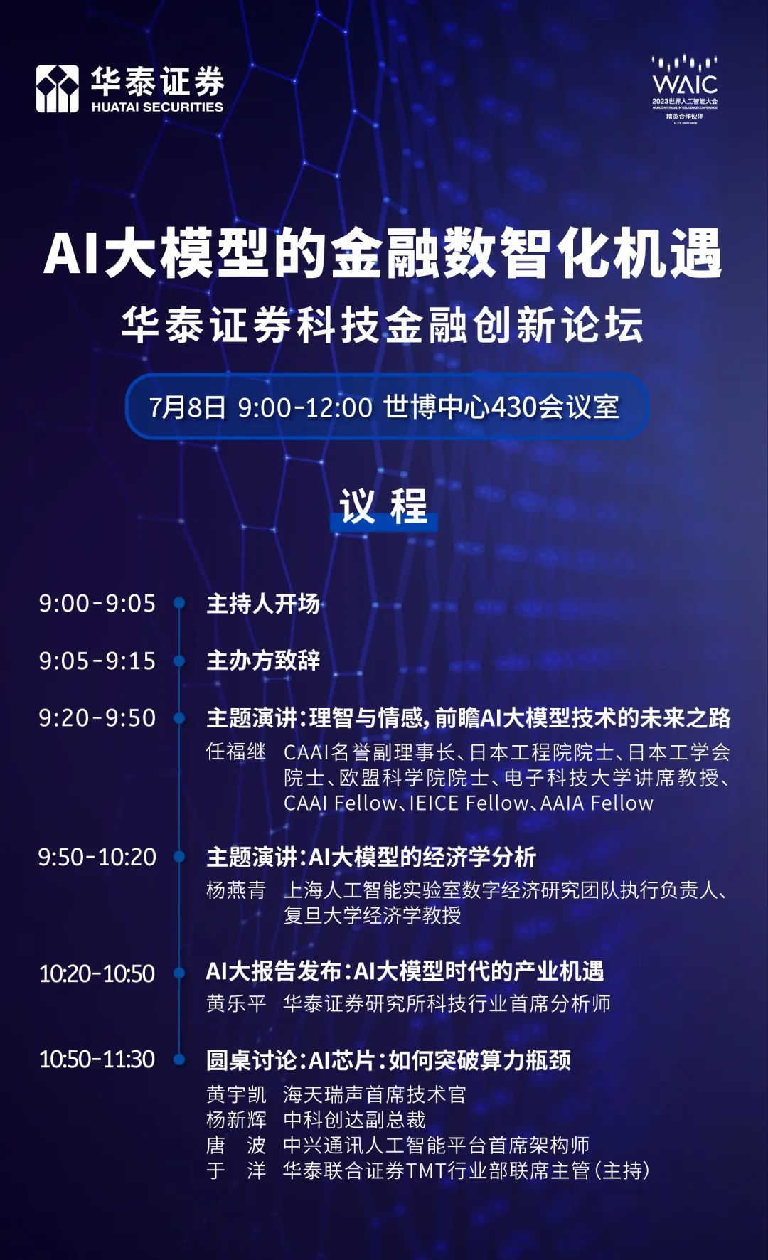 华泰证券作为证券业内的科技先行者,致力于打造多方参与的科技创新生态。7月8日上午,华泰证券将在2023年世界人工智能大会举办“AI大模型的金融数智化机遇”科技金融创新论坛。此次论坛不仅有从事情感计算的知名学者来聊一聊人工智能的“理智”与“情感”,前瞻AI大模型技术的发展趋势,还将邀请产业专家、投资专家碰撞大模型技术的在包括金融等产业的应用前景以及投资机遇。
