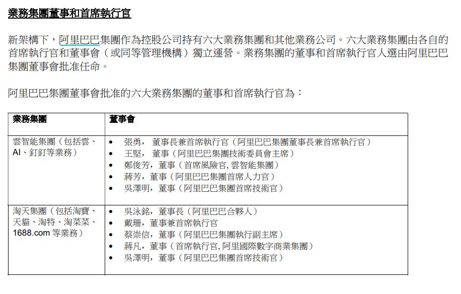公告称,经过阿里巴巴控股集团董事会批准,集团执行副主席蔡崇信将出任阿里巴巴控股集团董事会主席;吴泳铭出任阿里巴巴控股集团CEO,同时继续兼任淘天集团董事长。