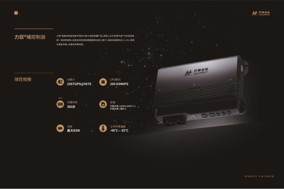力驭®是面向智能驾驶市场的大算力域控制器产品,其核心芯片后摩鸿途™H30采用存算一体创新架构,高效支持各类网络模型和自定义算子,赋能末端物流无人小车、乘用车智能驾驶、车路协同等场景。