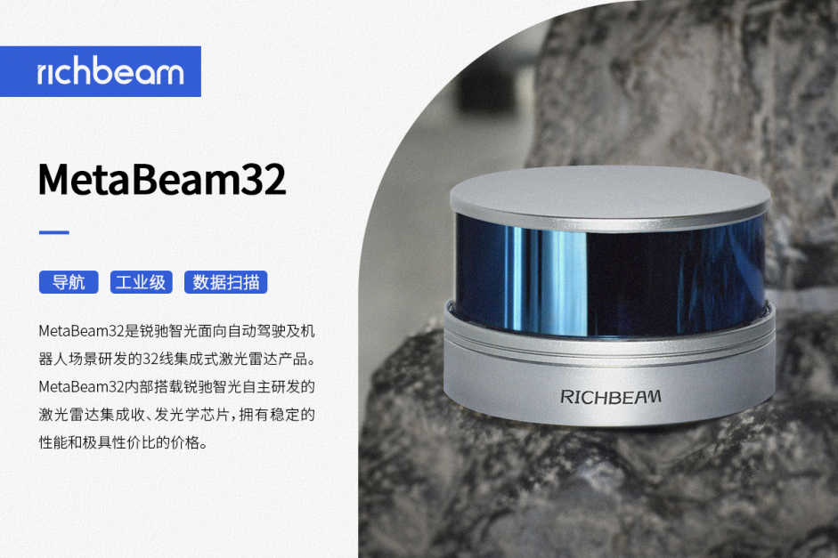 MetaBeam32是锐驰智光面向自动驾驶及机器人场景研发的32线集成式激光雷达产品。MetaBeam32内部搭载锐驰智光自主研发的激光雷达集成收、发光学芯片,拥有稳定的性能和极具性价比的价格。