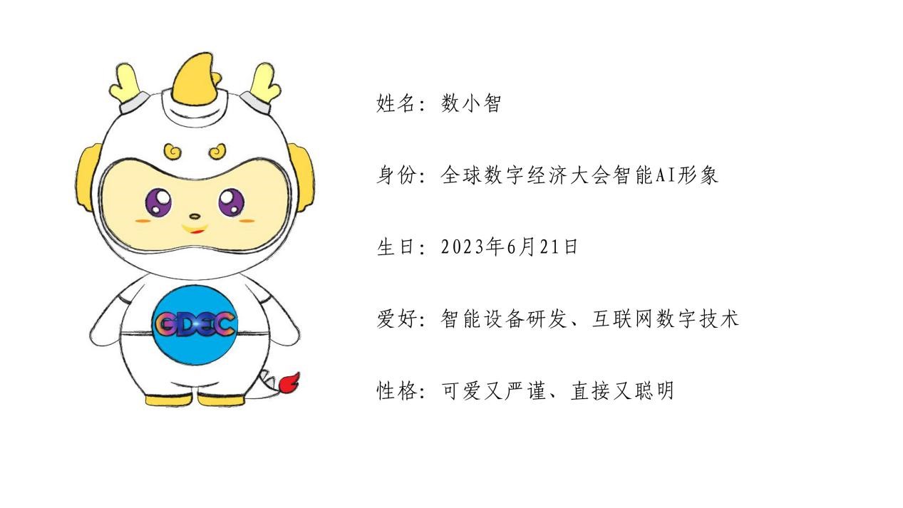 经过面向社会大众广泛征集,组委会从140个应征名称中,最终确定2023全球数字经济大会吉祥物取名“数小智”。作为一个代表“智慧、志气、智能”的形象,“数”取自数字经济,“小智”取自人工智能和人类的智慧。