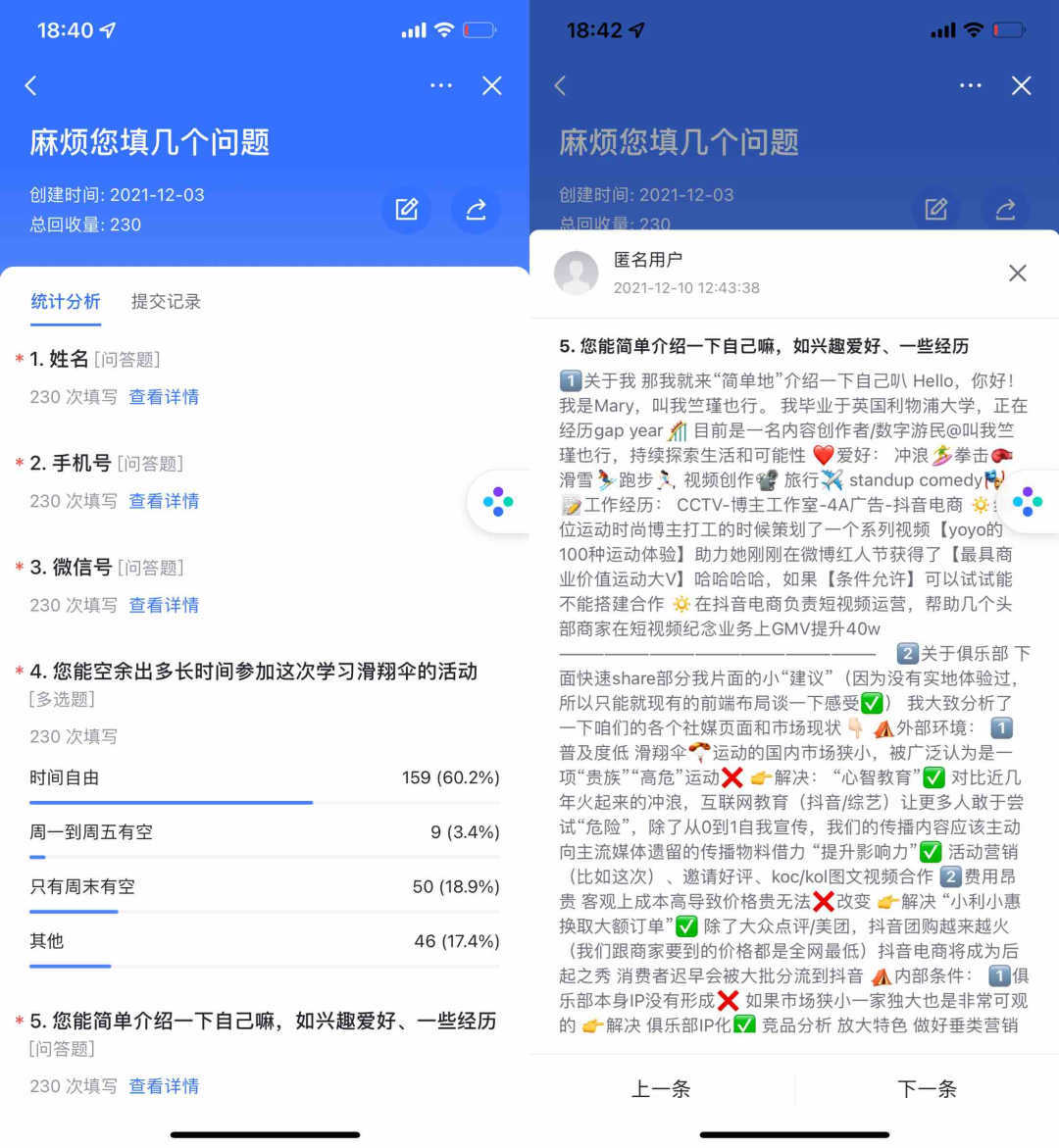 在即刻飞行俱乐部的官方账号上,他发布了一则体验官招募启事,邀请5位年轻人来学习滑翔伞,并承诺“管吃管住”。这一则启事为 Power 带来了数千条评论,他将飞书的问卷链接发送给评论者,迅速又清晰收集到了230份简历,成功解决了“招人难”的问题。