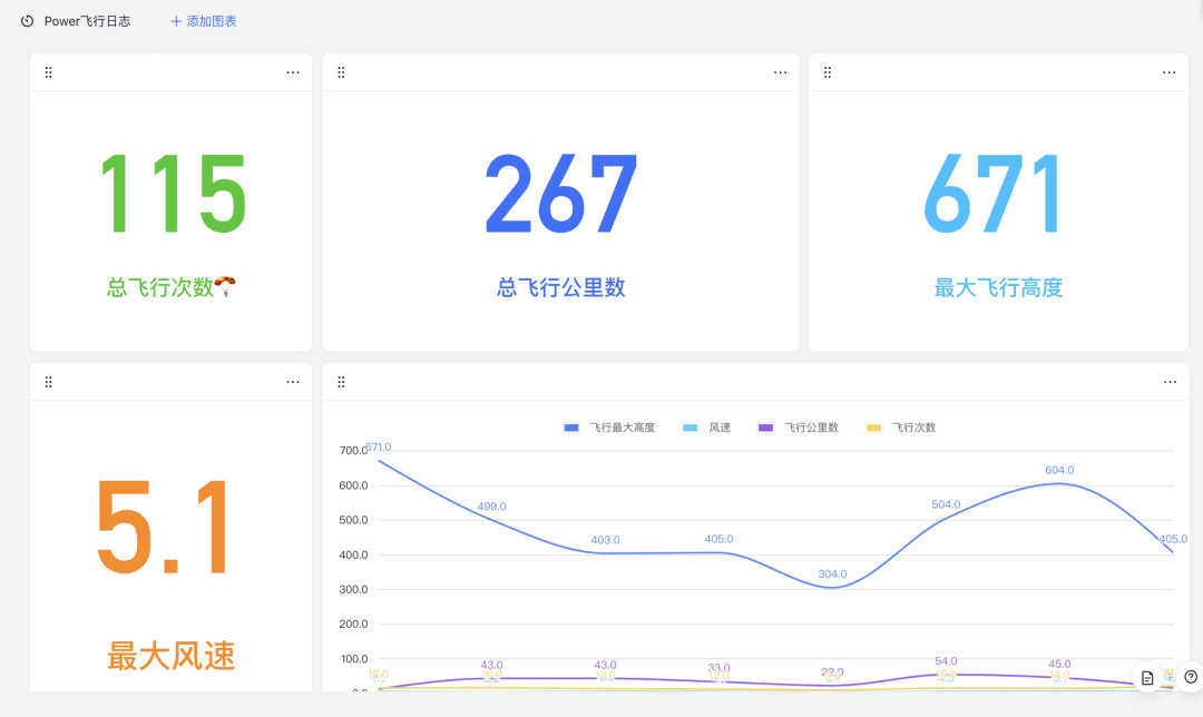 飞书的仪表盘功能一上线就吸引了 Power 的关注,他立刻想到仪表盘的可视化可以跟滑翔伞业务结合起来。一阵鼓捣之后,他就把仪表盘用“活”了。通过仪表盘,学员的飞行次数、里程数、飞行高度、风速一目了然。除了总数统计,这些维度的变化也能够直接呈现出来。飞行记录的线上化、及时化也为学员的飞行增加了一份安全保障,能实现学员填写后教练立马收到通知,及时反馈异常,让飞行记录真正发挥应有的作用。