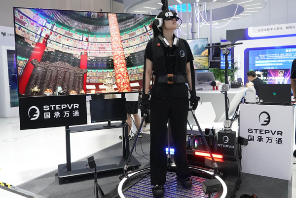 7月4日,在2023全球数字经济大会精品主题展现场,工作人员展示VR万向跑步机。