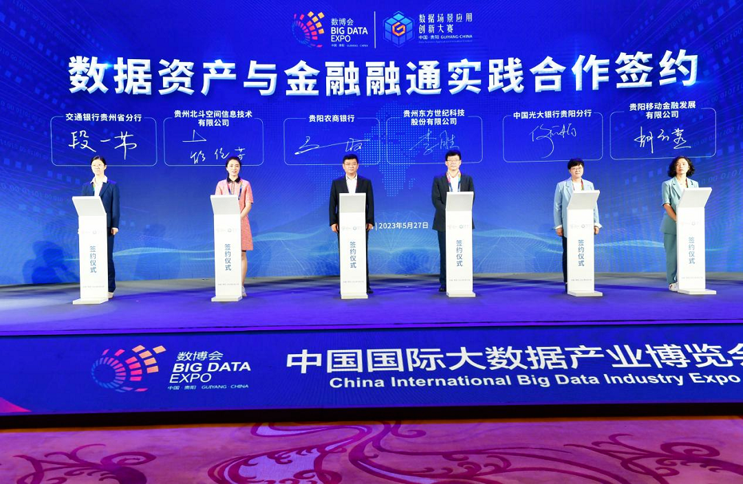 5月27日,在2023数博会“数据场景应用创新大赛颁奖仪式暨数据流通交易论坛”上,三家银行机构与贵阳大数据交易所数据商进行了“数据资产与金融融通实践合作签约”。