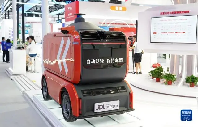 这是7月4日在2023全球数字经济大会精品主题展现场拍摄的自动配送车。