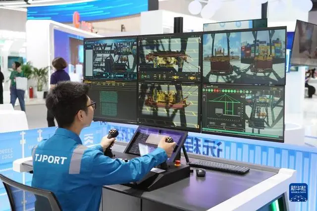 这是7月4日在2023全球数字经济大会精品主题展现场拍摄的自动化岸桥远程操控模拟系统。