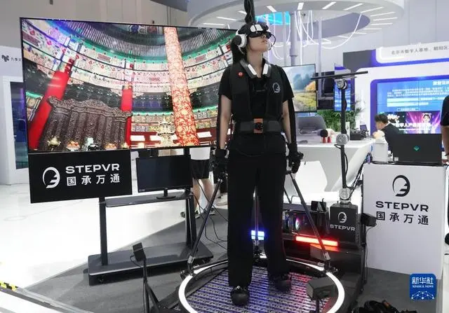 7月4日,在2023全球数字经济大会精品主题展现场,工作人员展示VR万向跑步机。