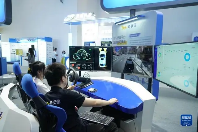 7月4日,在2023全球数字经济大会精品主题展现场,工作人员(右)进行汽车仿真平台漏洞攻防演示讲解。
