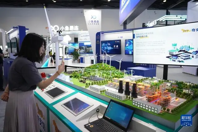 这是7月4日在2023全球数字经济大会精品主题展现场拍摄的新能源风力和太阳能发电仿真沙盘。