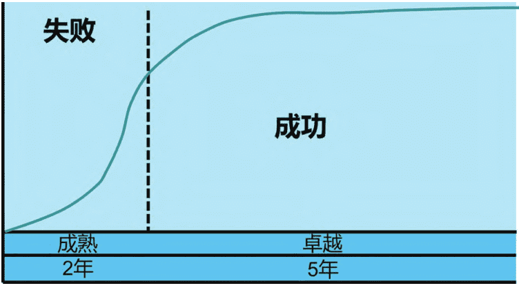 在“卓越”的含义中,成功的可持续性是重点,在“成熟”的含义中,成功的可重复性是重点。可以说,“成熟”度量组织的过程,“卓越”度量组织的产出。但同时它们又是相互关联的,成熟度越高,组织管理效率就越高,效果越好,因此组织的表现(performance)也将被提升,成熟有助于卓越的达成,而且必须成熟才能取得卓越。从成熟走向卓越的过程,成功逐渐多于失败,到达卓越后,组织就连续获得成功,如图3。