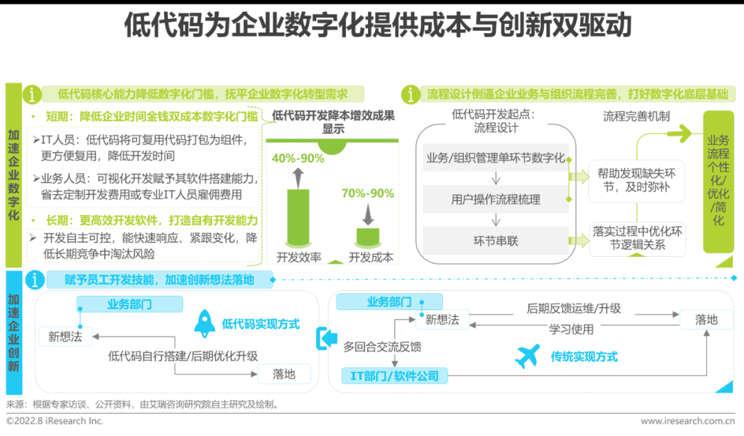 低代码易用性将企业数字化转型的时间与金钱成本门槛拉低后,其流程设计的环节在将企业运转机制落实到“白纸黑字”的过程中帮助企业进一步完善业务或组织运转流程。长期视角中,低代码平台将企业需求与自主开发深度融合,打造出可持续性的、紧跟变化的IT服务能力来经受瞬息万变的时代考验。但企业要在时代洪流中屹立不倒,仍需保持创新动力,而低代码能够赋予普通业务人员开发技能、加速创新想法落地,帮助公司探索新的业务增长路径。中国数字化转型网www.szhzxw.cn