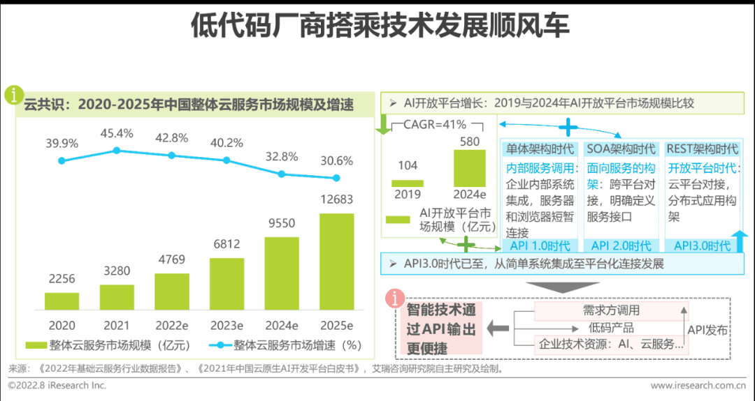 2021年,中国整体云服务市场规模达到3280.2亿元,增速为45.4%。云服务已在供给端形成较为稳固的市场格局,上云与用云成为需求侧的共识,为其他科技的发展奠定基础。本盛末荣,在云计算的支持下,大数据、区块链、人工智能、物联网等技术发展进一步完善,预计到2024年AI开放平台市场规模将达到580亿,API也进入REST架构时代,向着标准化稳定化趋势前进。API与各技术的齐头并进使得多种技术资源输出更加便捷,客户和普通大众可以在低代码平台上使用企业通过API输出的技术资源来完成各自的产品和服务开发。这并不需要付出大量的研发成本及时间就可使低代码产品能力的发展更上一层,增强产品的易用性与客户的使用体验,推动整个行业进入新的增长曲线。中国数字化转型网www.szhzxw.cn