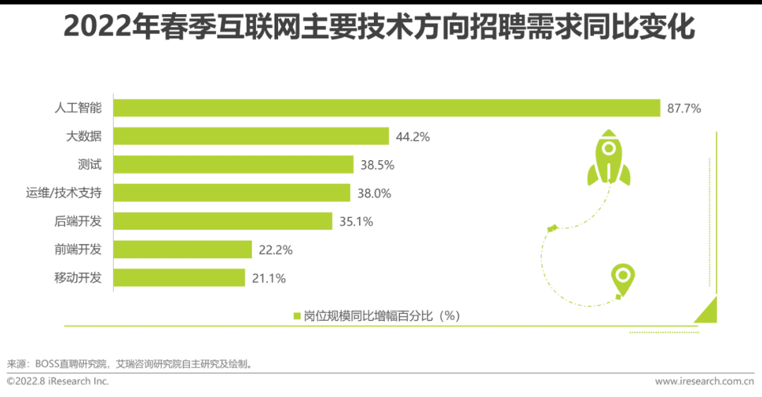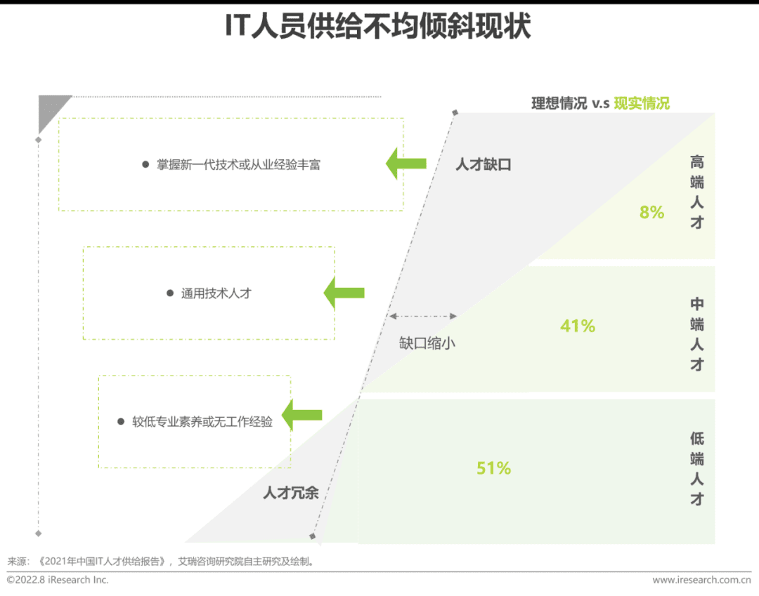在中国2022年春季的互联网主要技术方向招聘需求统计中,岗位规模同比增幅在20%至90%之间,企业对IT人才的需求仍盈千累万,但是人才供给侧却存在着人才结构失衡现象。高端人才稀缺,低端人才虽有冗余但因岗位价值不高,薪资较低,招聘依旧困难,“招聘难”在高低两端均有凸显。