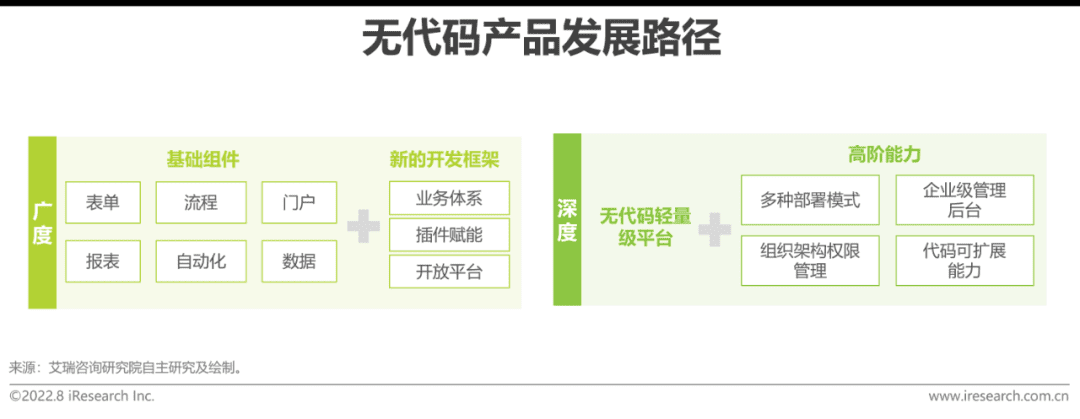 作为广义低代码的两种产品形态,低代码和零代码的发展路径有所差异。低代码更强调敏捷开发的能力,在产品的可扩展性和集成能力上更强,以此为基础不断向更加自动化、智能化的技术融合形态演进,进而可以从轻量级分析页面到具备处理复杂报表和数据的能力,从表单驱动、模型驱动向数据驱动演进。无代码则更强调产品的易用性和用户体验,在满足客户基础功能需求的基础上,不断从广度和深度上拓展产品的高阶能力,使得产品易用性和功能性更为强大。广度上,可以在基础组件之上进行开发框架的研发。在深度上,则可以在基础无代码平台能力之上增加组织权限架构管理、企业级管理后台等高阶能力,丰富无代码在企业数字化转型中的应用场景。中国数字化转型网www.szhzxw.cn