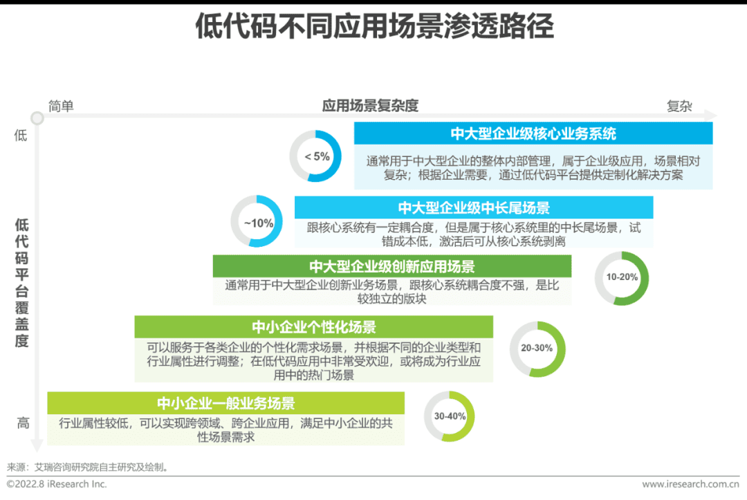 低代码在不同应用场景的渗透率受产品功能覆盖度和应用场景复杂度两方面共同影响,中小企业一般业务场景由于需求简单,且通用性较强,低代码渗透较早,应用覆盖更为全面,随着产品技术积累和需求侧认知提升,不断由中小企业个性化场景、中大型企业创新应用场景、中长尾场景向中大型企业核心业务系统渗透。