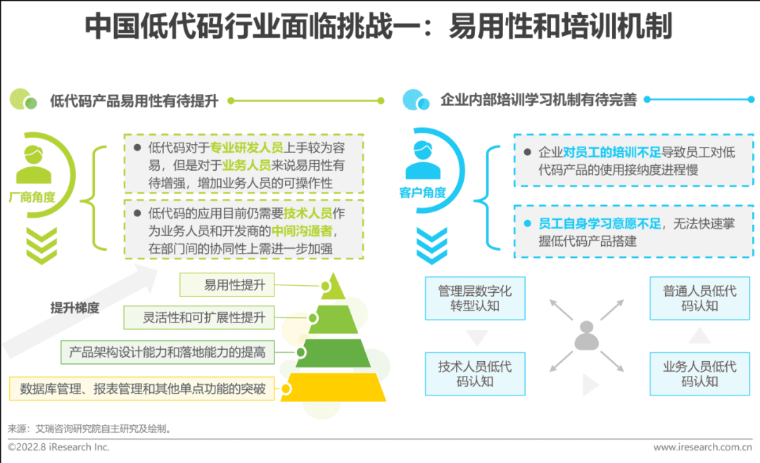 低代码开发相对传统软件开发形式大大降低了操作门槛,且使用群体也从开发人员向业务人员渗透,但从应用现状上来看,普通操作者无法熟练的独立完成应用搭建,仍需要技术人员在一线业务人员和厂商之间进行沟通。一方面是低代码产品本身的易用性有待进一步提升,包括底层技术框架和可视化界面的呈现;另一方面企业在采购低代码产品后无法提供相对完善的培训机制,导致员工对低代码的接受度和上手能力进程缓慢,也在一定程度上影响了低代码应用的广泛性。中国数字化转型网www.szhzxw.cn