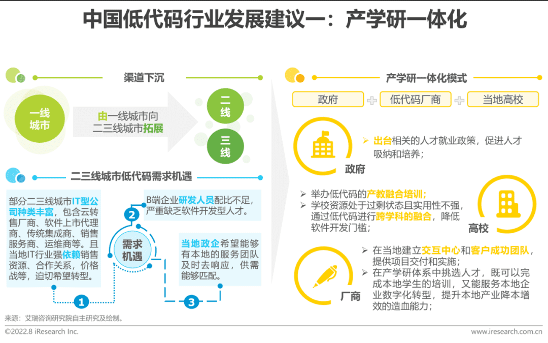 针对低代码本身面临易用性和市场需求广泛性的问题,关键在于解决人才短缺,如果人才发展得不到解决,低代码在一线城市需求市场和渠道下沉市场中的影响力会大打折扣。而面对庞大的未渗透的市场空间,产学研一体化模式或将给行业发展提供一种新的思路。产学研一体化主要是在政府、低代码厂商、当地高校三方参与下,各自角色相互配合,实现“以产养研,以研促产”的正循环模式,助力区域人才发展和低代码的快速落地。中国数字化转型网www.szhzxw.cn