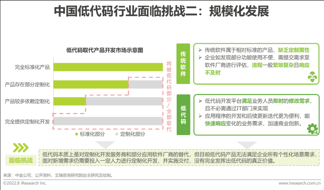 低代码产品通过提供应用开发平台满足企业个性化需求,将侵蚀原有需要定制化开发的市场空间,替换掉软件中非标准化开发部分,敏捷响应市场需求和业务创新。原有定制化开发的传统软件集成商或转型做自己的低代码产品,或与低代码厂商成为生态伙伴进行合作开发,提升整体市场的开发效率。但目前低代码产品除了提供标准产品开发平台外,面对企业的个性化场景需求,仍需要投入一定人力进行定制化开发或二次开发,并实施交付,没有完全发挥出低代码的真正价值。企业尤其是中大型企业复杂应用场景中产品定制化过重仍是制约低代码厂商进行规模化扩张的主要瓶颈之一。中国数字化转型网www.szhzxw.cn