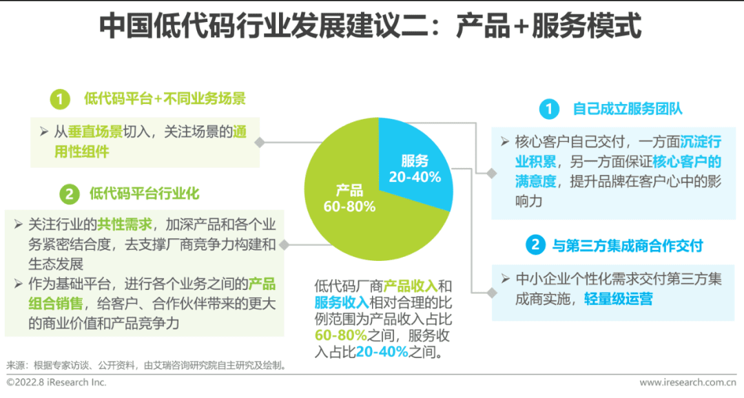 针对产品标准化和定制化的平衡问题,低代码厂商的发展模式逐渐出现分化。无代码厂商天然具备轻量级交付基因,但是为了满足更多应用场景的需求,逐渐增加定制化开发的服务内容,而低代码厂商则由原来需要定制化交付的过程逐渐抽象出更多通用模块进行商业模式的轻量化转型。面对不同场景和不同行业的应用需求,厂商的定位逐渐清晰,越来越多的厂商选择产品+服务两条腿走路,且两者的收入结构占比愈加合理化。通过调研发现,产品收入占比60-80%之间,服务收入占比20-40%之间是相对比较合理的范围。且产品的拓展中需要和业务场景和行业需求更加紧密的结合,服务交付部分则可以根据客户的核心程度及交付难度选择厂商自身交付还是与第三方集成商合作交付。根据厂商自身产品特征和定位进行结构调整,使得客户满意度和厂商运营能力最大化。中国数字化转型网www.szhzxw.cn