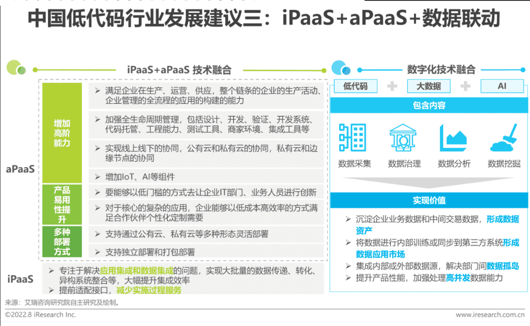 针对低代码产品功能和需求的匹配度问题,可以通过加速iPaaS和 aPaaS 的集成和融合来优化。应用系统建设往往会和已有的系统进行大量集成,iPaaS层级可以帮助客户专注于解决应用集成和数据集成的问题,实现大批量的数据传递、转化、异构系统整合等,大幅提升集成效率。此外,aPaaS上面会构建大量业务应用,iPaaS+aPaaS的融合会沉淀大量中间交易数据,这些数据被采集、加工、处理、分析后形成数据资产,加速数据资产在企业中的联动应用,增加企业数据应用价值。中国数字化转型网www.szhzxw.cn