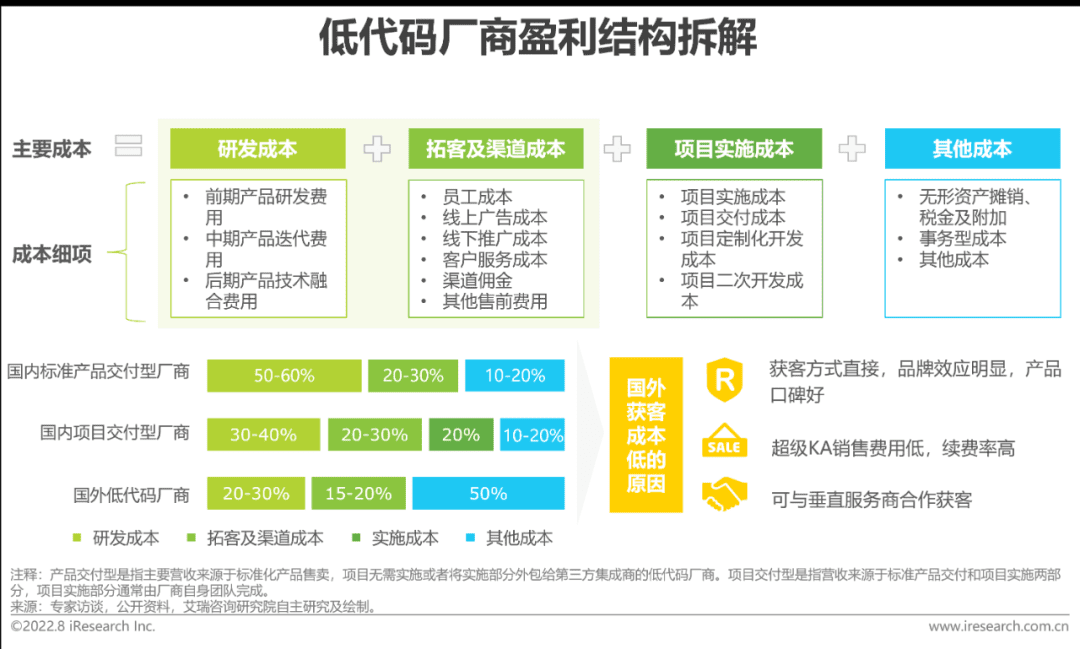 目前大多数低代码厂商处于发展初期阶段,研发成本和获客成本居高不下,占据成本结构中的绝大比例。但根据厂商商业模式的差异,盈利结构有所不同,国内标准产品交付型厂商由于以售卖标准产品或平台为主,营收来源单一,但成本结构相对稳定,研发成本占据一半左右。而项目交付型厂商服务链条较长,涉及后期项目实施和交付成本,会吃掉一定比例的毛利。对比国外厂商来看,由于国外低代码厂商获客方式更为直接,且头部品牌效应明显,主动客户线索较多,整体获客成本低于国内厂商,盈利能力相对较好。