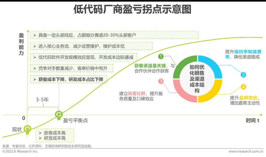 低代码厂商未来盈利能力是资本市场态度回归理性的重要因素之一,低代码厂商目前仍面临着成本高、竞争激烈、同质化产品严重、行业集中度低等经营困境,且多数厂商处于早期市场摸索阶段,产品客户定位、行业经验、产品技术等仍需市场验证,盈利拐点仍需时间。根据艾瑞咨询判断,盈利拐点的出现具备以下几点特征:1.积累细分赛道20-30%客户,具备一定头部效应;2.产品技术相对成熟,进入核心业务流;3.规模效应显现,开发和维护成本降低;4.销售费用下降,客单价稳步抬升。未来,随着需求端爆发及供给侧环境优化,预计3-5年会有一批厂商率先进入盈亏平衡周期。