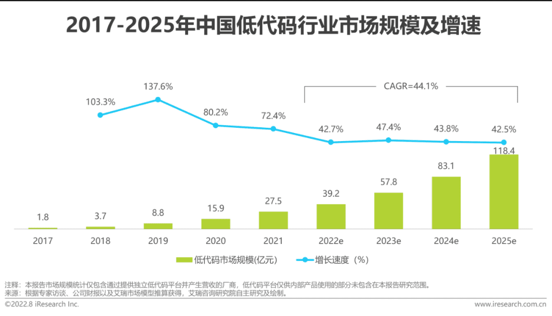 低代码行业经历了2017-2020年的快速发展阶段,市场增速开始有所放缓,在企业数字化转型及疫情的助推下, 2021年低代码行业市场规模达到27.5亿,增长速度为72.4%,预计未来4年复合增速达到44.1%,2025年中国低代码行业市场规模将达到118.4亿。中国数字化转型网www.szhzxw.cn