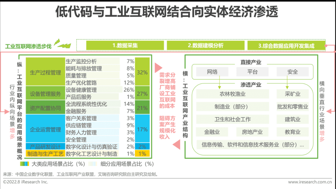 工业互联网将新一代信息通信技术与工业经济深度融合,并向交通、物流、能源等多实体经济领域渗透,加速产业数字智能化转型,是大势所趋。从采集、分析,再到综合数据进行应用开发集成,工业互联网面临的细分应用场景不断分裂,且渗透的垂直行业种类日渐增多。末端需求种类的量变带来的海量项目开发将阻碍厂商正常商业模式下的规模化营收产生,也会进一步阻碍工业互联网渗透的最后一公里。因而,越来越多的低代码工具出现在与工业互联网相关的应用开发集成场景中,发挥短周期灵活搭建个性化应用的优势,快速满足末端多样化需求的定制,并与原有系统集成打通,减轻工业互联网供给商开发负担,借助工业互联网的铺开加速与实体经济使用场景的融合。中国数字化转型网www.szhzxw.cn